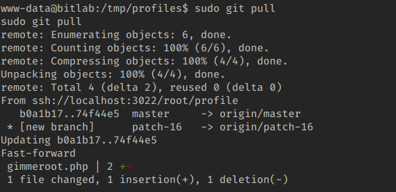 Now we do sudo git pull and expect the post-merge to execute and give us a shell as root.